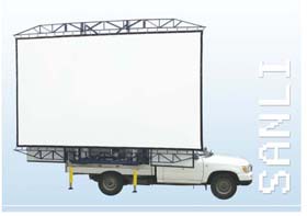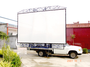 一、方便、簡捷。放映舉升架平時合攏後,隱於小型貨車(chē)廂內,外形為一輛小型輕型貨車。使用時通過液(yè)壓動力移(yí)出車廂,展開舉升架和銀(yín)幕。幕、架一體,機械傳動科學、穩定。
